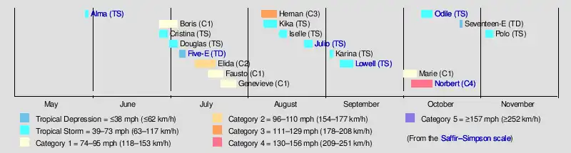 The 2008 Pacific hurricane season was a near-average Pacific hurricane season which featured seventeen named storms, though most were rather weak and short-lived. Only seven storms became hurricanes, of which two intensified into major hurricanes. This season was also the first since 1996 to have no cyclones cross into the central Pacific (between 140°W to the International Date Line).[1] The season officially began on May 15 in the eastern Pacific (east of 140°W) and on June 1 in the central Pacific. It ended in both regions on November 30. These dates, adopted by convention, historically describe the period in each year when most tropical cyclone formation occurs in these regions of the Pacific. This season, the first system, Tropical Storm Alma, formed on May 29, and the last, Tropical Storm Polo, dissipated on November 5.