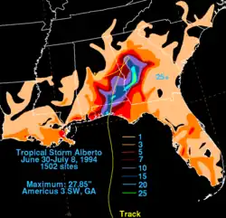- ^ Edward N. Rappaport (December 7, 1994). "Table 2b. Selected additional rainfall accumulations (inches) associated with Alberto". Preliminary Report: Tropical Storm Alberto 30 June – 7 July 1994 (Report). National Hurricane Center. p. 9. Retrieved August 4, 2024.