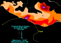 Tropical Storm Carlos was the first of five tropical cyclones to make landfall during the 2003 Pacific hurricane season. It formed on June 26 from a tropical wave to the south of Mexico. It quickly strengthened as it approached the coast, and early on June 27 Carlos moved ashore in Oaxaca with winds of 65 mph (105 km/h). The storm rapidly deteriorated to a remnant low, which persisted until dissipating on June 29. Carlos brought heavy rainfall to portions of southern Mexico, peaking at 337 mm (13.3 in) in two locations in Guerrero. Throughout its path, the storm damaged about 30,000 houses, with a monetary damage total of 86.7 million pesos (2003 MXN, $8 million 2003 USD). At least nine people were killed throughout the country, seven due to mudslides and two from river flooding; there was also a report of two missing fishermen.