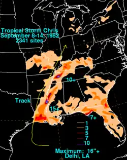 - ^ a b c d e f g h David M. Roth (2007-05-16). "Tropical Storm Chris - September 8-14, 1982". Hydrometeorological Prediction Center. Retrieved 2012-01-01.