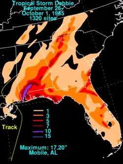 5. ^ a b c David M. Roth (2009-04-12). "Tropical Storm Debbie - September 26-October 1, 1965". Hydrometeorological Prediction Center. Retrieved 2011-10-20.