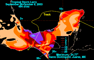 Tropical Storm Larry was one of eight storms to hit Mexico from either the Atlantic Ocean or the Pacific Ocean, the highest since the record of nine in 1971.[8] The National Hurricane Center expected the storm to produce a storm surge of 3 to 5 feet (0.91 to 1.52 m), with high waves on top,[9] though no official surge readings were reported.[2] The highest recorded winds on land were 59 mph (95 km/h) in El Alacrán in Tabasco. The worst of Larry's effects came from its rainfall, peaking at 24.77 inches (629 mm) in Upper Juarez in southeastern Mexico.[10] The highest 24-hour rainfall total was 9.6 inches (240 mm) in Tortuguero, Chiapas,[8] while several other locations reported over 4 inches (100 mm) in 24 hours.[1]