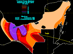 While the National Hurricane Center initially classified the depression, it was noted in post-analysis that the system had already intensified into Tropical Storm Matthew,[1] but was operationally carried as a tropical depression until 21:00 UTC September 23. based on confirmation from Hurricane Hunters. At the time, it was moving generally westward, due to a subtropical ridge over the northwestern Caribbean Sea and Gulf of Mexico. Tropical cyclone prediction models anticipated a path near or over Nicaragua, followed by Matthew stalling near the Yucatán Peninsula due to a collapse in steering currents. There was uncertainty in the timing of the latter events, and the NHC noted that great intensification could occur if the storm remained over warm waters; this was due to favorable conditions, such as sea surface temperatures exceeding 30 °C (86 °F) and an upper-level anticyclone providing good outflow.[8] As the storm gradually strengthened during the morning of September 24 after a burst in convection, and the National Hurricane Center noted that there was a considerable uncertainty over the path Matthew would take in the long run. Some numerical models forecast the tropical storm to pass through the Yucatán Peninsula into the Bay of Campeche, while others forecast Matthew to reach the peninsula's coast, then do a sharp turn to the northeast back into the Caribbean Sea. As such, the NHC considered its track forecast—and by extension, its intensity forecast—to be of "low confidence."[9][10]