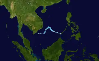 On December 22, 2024, the Kalayaan Islands were issued Signal No. 1, where a wind speed of 39 km/h (24 mph) to 61 km/h (38 mph) is expected.[5] That same day, the municipality of Balabac, Palawan was added to Signal No. 1.[18] A few hours later, Balabac was removed.[19] On December 23, 2024, all signals were removed as Pabuk moved away from the Philippines.[11] Online, rumors were made that Pabuk would make landfall over Thailand on December 20, 2024, though the national agency said that the rumors were false.[20] On December 23, 2024, heavy rain was recorded in the South Central Coast and Central Highlands of Vietnam.[21] On December 24, 2024, an advisory was made by the Malaysian Meteorological Department for Pabuk, noting that rough seas are expected within the South China Sea.[22]