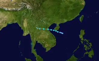 Shortly thereafter, Talas began to weaken due to land interaction and the JMA downgraded the system back to a tropical storm.[12] Around 18:00 UTC, the storm made landfall in Central Vietnam, near the city of Vinh.[13] Three hours later, the JTWC issued their final advisory on Talas as it continued to degrade while progressing inland.[14] Early in the following day, when the weakening storm was located over the northern portion of Laos, the JMA issued their final advisory as well.[15]