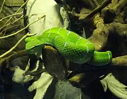 Tropidolaemus wagleri, more commonly known as Wagler's pit viper, is a species of venomous snake, a pit viper in the subfamily Crotalinae of the family Viperidae. The species is endemic to Southeast Asia. There are no subspecies that are recognized as being valid.[3] It is sometimes referred to as the temple viper because of its abundance around the Temple of the Azure Cloud in Malaysia.