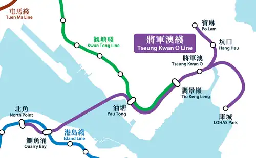 The Tseung Kwan O line (Chinese: 將軍澳綫) is one of the ten lines of the MTR system in Hong Kong. It is currently 12.3 kilometres (7.6 mi) long, taking 15 minutes to travel throughout the entire line. It is indicated in Purple on the MTR map.