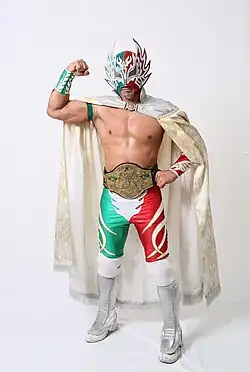 Tsubasa (ツバサ, Tsubasa) (sometimes stylized in capital letters as TSUBASA) is a Japanese professional wrestler currently working as a freelancer and is best known for his tenure with the Japanese promotion Osaka Pro Wrestling where he is a former Osaka Openweight Champion.[3] A masked wrestler, Tsubasa is greatly influenced by lucha libre, and because of this, he has followed Mexican tradition for masked wrestlers, so his real name is not a matter of public record.