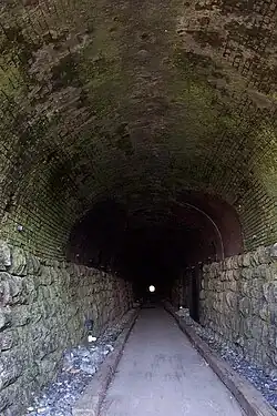 | Brick-lined interior of the W&A tunnel, now preserved as a walking trail, looking southeast. |