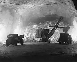 The humid conditions in the tunnels meant that ordinary corrugated iron corroded extremely rapidly, so the buildings within the tunnels were constructed using iron sheeting that had been coated in bitumen.[19] A gap of 2 feet (0.61 m) was left between the buildings and the rock walls to enable ventilation and drainage and to facilitate inspections of the rock.[18] Power was provided by four electrical power stations with a total installed load of 1,200 kW; water, electricity and oil were channelled via pipes and cables fixed to the tunnel walls, with drainage pipes running along the floors. The ventilation was provided by natural currents of air.[19]