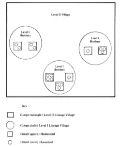 The Turu people define their social organization through lineage or ancestry. The photo to the right visualizes the social composition of the average Turu village. The first level lineage (level 1) is made up of adult brothers, and a second level lineage (level 2) is made up of several level 1 lineages. A Turu village is described as a single level 2 lineage. Several level 2 lineages make a clan (level 3), and several level 3 lineages make up a subtribe (level 4).[4]
