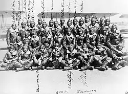 The first class (42-C), which included student officer Captain Benjamin O. Davis, Jr., began training on July 19, 1941. who served as Commandant of Cadets. Twelve cadets served with him under Captain Noel F. Parrish, a white officer, and 2nd Lieutenant Harold C. Magoon, another white officer, who served as the adjutant. The other cadets were John C. Anderson, Jr., Charles D. Brown, Theodore E. Brown, Marion A. Carter, Lemuel R. Custis, Charles H. DeBow, Jr., Frederick H. Moore, Ulysses S. Pannell, George S. Roberts, Mac Ross, William H. Slade, and Roderick C. Williams. Only five of these cadets completed the advanced flying training at Tuskegee Army Air Field (about five miles from Moton Field), in March 1942.[3]