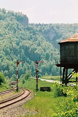 The Tuttlingen–Inzigkofen railway is a single-track and non-electrified 37.08 km-long railway in southern Baden-Württemberg, Germany. The line connects Tuttlingen station with the Tübingen–Sigmaringen railway at Inzigkofen junction, which was once the site of Inzigkofen station. The line runs over its entire length along the headwaters of the Danube and it is therefore considered by Deutsche Bahn to form part of the Donaubahn (Danube Valley Railway) from Donaueschingen to Ulm.