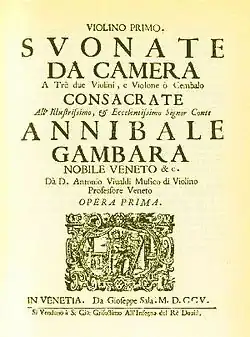 Twelve Trio Sonatas, Op. 1 is the first collection of musics composed by Antonio Vivaldi, and published by the Venetian publisher Giuseppe Sala in 1705, the first edition is believed to have been published around 1703. These trio sonatas are for two violins and basso continuo. The last music is a same title of "La Follia" as Corelli's Twelve Violin Sonatas, Op. 5.[1]