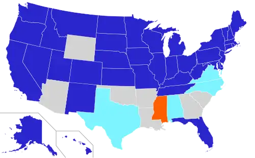 Congress proposed the Twenty-fourth Amendment on August 27, 1962.[17][18] The amendment was submitted to the states on September 24, 1962, after it passed with the requisite two-thirds majorities in the House and Senate.[15] The final vote in the House was 295–86 (132–15 in the House Republican Conference and 163–71 in the House Democratic Caucus) with 54 members voting present or abstaining,[19] while in the Senate the final vote was 77–16 (30–1 in the Senate Republican Conference and 47–15 in the Senate Democratic Caucus) with 7 members voting present or abstaining.[20] The following states ratified the amendment: