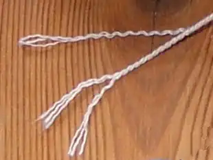 Twine is a strong thread, light string or cord composed of string in which two or more thinner strands are twisted, and then twisted together (plied). The strands are plied in the opposite direction to that of their twist, which adds torsional strength to the cord and keeps it from unravelling. This process is sometimes called reverse wrap.[1] The same technique used for making twine is also used to make thread, which is thinner, yarn, and rope, which is stronger and thicker, generally with three or more strands.