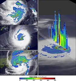 A series of satellite images from the Tropical Rainfall Measuring Mission satellite depicting the structural evolution of Typhoon Ma-on from October 3–9.