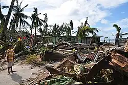 Two days after striking Chuuk, Maysak passed directly over Ulithi atoll and skirted Fais Island at peak intensity, resulting in extensive damage.[35][37] According to Guam Governor Eddie Calvo, sustained winds reached 210 km/h (130 mph) in Ulithi and 160 km/h (100 mph) on Fais,[38] with gusts reaching 240 km/h (150 mph) on Ulithi.[33] All structures on Ulithi not made of concrete were severely damaged or destroyed by Maysak's powerful winds.[39] Power and water supplies to Ulithi were completely lost during the storm.[40] The entirety of the island's crop were ruined by the typhoon's storm surge, with early estimates indicating that it would be a full year before crops could be planted again.[38] Though spared a direct hit, Yap proper was also hit hard with reports of airborne debris during the storm.[37] Outlying islands were also affected; on Faraulep, water wells were contaminated and fruit trees were knocked down.[34] During the storm, 18 fishermen were stranded Pikolot Island and West Fayew Island, but they returned home afterward.[41]