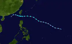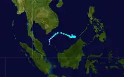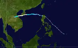 A tropical depression formed 1,050 kilometres (650 mi) east-southeast of Manila on July 4. Moving west-northwest, the system crossed the central Philippines on July 5, moving into the South China Sea on July 6. Moving more towards the north on July 7, the depression moved inland into southern China east of Hong Kong on July 8. In Hong Kong, winds gusted to 47 knots (87 km/h) at Tate's Cairn, where 114.1 millimetres (4.49 in) fell.[1] While Hong Kong considered it a tropical depression throughout its life cycle, PAGASA named the system and considered it a tropical storm.[7]