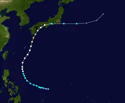 A disturbance was first noted in the vicinity of Micronesia on June 17 approximately 400 km (250 mi) south of Guam. Aircraft traversing between Guam and the Philippines eventually confirmed the presence of a developing tropical depression by June 25, tracking towards the west.[7] By the following day, the system had strengthened into a tropical storm. The system curved towards the north by June 28 and had begun to trend towards the northeast thereafter, gradually strengthening to a typhoon by 18:00 UTC that day. The storm continued to accelerate towards the northeast, passing just east of the Ryukyu Islands on June 30 before reaching peak intensity offshore Kyushu with maximum sustained winds of 185 km/h (115 mph) and a central pressure estimated at 975 mbar (975 hPa; 28.8 inHg). Kate weakened slightly before making landfall the following day on Shikoku with winds of 170 km/h (110 mph).[16] The typhoon curved eastward and continued to weaken, tracking through Sagami Bay and emerging over the Pacific Ocean on July 2 as a tropical storm.[7][16] Kate transitioned into an extratropical cyclone and would later dissipate the following day.[17]
