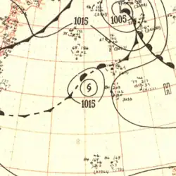In late April, a well-developed tropical wave began developing east of Chuuk Lagoon.[9] Tracking westward, the easterly wave was analyzed to have organized into a tropical depression by 0000 UTC on April 29.[10] Twelve hours later, Iris was estimated to have strengthened into a tropical storm.[11] At roughly the same time, a vessel in the vicinity of the storm reported winds in excess of 65 km/h (40 mph), prompting the Guam Fleet Weather Center to initiate reconnaissance flights into the cyclone.[7] Midday on April 30, Iris intensified into the equivalent of a modern-day typhoon as it moved in a slightly oscillatory path towards the Philippines.[7][11] After a slight fluctuation in intensity during the overnight hours of May 1, Iris rapidly intensified to reach its peak intensity with a minimum pressure of 909 mbar (909 hPa; 26.8 inHg) and maximum sustained winds of 280 km/h (170 mph) early on May 4,[11] making it the equivalent of a Category 5 super typhoon;[10] at the time this was the first confirmed instance of a typhoon reaching such intensities.[2] Afterwards, Iris weakened slightly before making landfall on South Luzon around 1800 UTC the following day.[11]