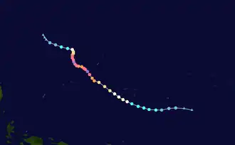 Typhoon Wutip, known in the Philippines as Tropical Depression Betty, was the most powerful February typhoon on record, surpassing Typhoon Higos of 2015.[1] The third tropical cyclone, second tropical storm, and the first typhoon of the 2019 Pacific typhoon season, Wutip originated from a low-pressure area on February 16, 2019, that generally tracked westward, passing just south of the Federated States of Micronesia (FSM), before organizing into a tropical depression on February 18. The depression was later classified a tropical storm a day later, attaining the name Wutip from the Japan Meteorological Agency. The storm gradually intensified as it turned northwest, before it underwent rapid intensification on February 23, while passing to the southwest of Guam, and reached its first peak intensity. With winds of 270 km/h (165 mph) estimated by the Joint Typhoon Warning Center, Wutip became the first Category 5-equivalent super typhoon on record in the month of February. Wutip underwent an eyewall replacement cycle shortly afterward and weakened. The storm finished its cycle on February 24, rapidly intensifying once again. Wutip reached a secondary peak intensity the following day, again attaining Category 5-equivalent winds. Thereafter, Wutip rapidly weakened for the rest of its lifespan from strong vertical wind shear, before dissipating over the Philippine Sea on March 2.