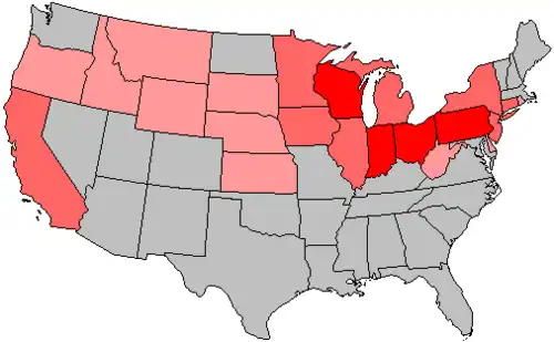 Meanwhile, the Republicans were united; they had shed their weakest members in a series of defeats since 1930.[3] Re-energized Republicans focused attention on strong fresh candidates in major states, especially Robert A. Taft, the conservative from Ohio,[4] Earl Warren (future Chief Justice), the moderate who won both the Republican and the Democratic primaries in California,[5] and Thomas Dewey, the crusading prosecutor from New York.[6] The Republican resurgence in 1938 was made possible by carrying 50% of the vote outside the South, giving GOP leaders confidence it had a strong base for the 1940 presidential election.[7]