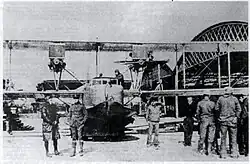 Due to some grievance, a general strike was called by the civilian workforce during the erection of the first hangar, but the strike was soon mitigated.[2] By 1 August 1918, there was still a considerable amount of minor work to be accomplished, and it was rapidly nearing the time for the arrival of the seaplanes. The first hangar had been completed by the civilian contractors along with the reservoir, the small water tank and majority of the road forming. The civilian workforce was dismissed on 15 August. The erection of the second hangar immediately started and the work progressed rapidly.