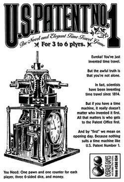 The first actual U.S. patent was issued on July 31, 1790, to Samuel Hopkins for the manufacture of potash. The game's cover art states that "if you have a time machine, it doesn't really matter who invented it first. All that matters is who gets to the Patent Office first." However, prior to the 2011 America Invents Act, the United States was the sole country with a "first to invent" rule. Unfortunately, proving prior conception when time travel is involved may present difficulties to the inventor.