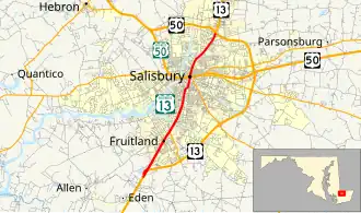 U.S. Route 13 Business (US 13 Bus.) is a business route of US 13 in the U.S. state of Maryland. The highway runs 8.14 miles (13.10 km) between US 13 south of Fruitland and US 13 and US 50 on the north side of Salisbury. US 13 Bus. is a four-lane highway with divided and undivided sections that provides access to Salisbury University, downtown Salisbury, where the highway intersects US 50 Bus., and Fruitland, where the highway meets Maryland Route 513 (MD 513). US 13 Bus. was constructed as a new alignment of US 13 in several steps in the 1930s and early 1940s. The section of the highway through Salisbury was originally constructed with four lanes, while the portion of the highway through Fruitland and at the northern end was expanded to a divided highway in the first half of the 1950s. US 13 Bus. was designated when US 13 was moved to the Salisbury Bypass upon its completion in 1981.