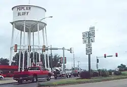 The eastern terminus of US 160 was originally located at an intersection with U.S. Route 60 and then-U.S. Route 66 in Springfield, Missouri (Grant Avenue and College Street). In the 1950s, the terminus moved eastward across the state to an intersection with then-US 60 and then-U.S. Route 67 (now US 60 Bus. and U.S. Route 67 Business) in Poplar Bluff. The extension between Springfield and Poplar Bluff was parallel to U.S. Route 65 from Springfield to Highlandville. Between Highlandville and Holister, the highways ran concurrently. Past Holister, US 160 headed east across the Ozark Mountains.[6] Route 160 was later routed further north in the Branson area, replacing a section of Route 148.[7] In 2007, the terminus was moved to its current location southwest of Poplar Bluff, eliminating a concurrency between US 160 and two other highways (US 67 and US 67 Business) over the last 10 miles (16 km) of US 160.