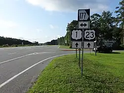 By June 1960, SR 15 was shifted eastward, onto a completely different alignment. It had two different concurrencies with US 1/SR 4: from the Florida state line to Racepond and from Baxley to South Thompson. In Augusta, SR 10 was shifted off of SR 4 and onto Gordon Highway. SR 21 was extended onto the SR 4/SR 12 concurrency on Twiggs Street and 7th Street. SR 21 reached its northern terminus at Broad Street. US 25 was shifted off of Broad Street and onto Gordon Highway, which was extended to the South Carolina state line. Its former path was redesignated as part of US 25 Bus.[24][25] By June 1963, SR 121 was placed on a concurrency from Folkston to Racepond.[25][26] By the end of 1965, a western bypass of Waycross was built from US 82/SR 50 west-northwest of the city to US 1/US 23/SR 4 northwest of it. SR 21 was extended west-northwest on US 25 Bus./SR 28 (Broad Street) and followed the business route to the South Carolina state line. SR 121 was extended on Gordon Highway from the US 25/SR 21/SR 121 interchange to the state line. Also, the intersection of Gordon Highway and Broad Street was converted into an interchange.[26][27]