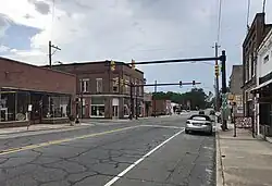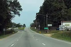 US 220 begins at an intersection with US 1 southwest of downtown Rockingham. From its southern terminus, US 220 travels north along a four-lane divided highway. It interchanges with Midway Road before crossing over a railroad owned by CSX Transportation.[2] Immediately north of the bridge, US 220 intersects US 74 Business (Broad Avenue) and runs west of downtown Rockingham. The highway makes a gradual turn to the northwest, crosses Little Carr Creek, and exits Rockingham to the north. US 220 continues through a suburban area of Richmond County, with a mixture of forested areas and neighborhoods along the highway. North of Rockingham, US 220 travels through a trumpet interchange north of Rockingham. The interchange marks the beginning of a four-lane freeway portion of US 220 which continues for 2.7 miles (4.3 km). US 220 exits the freeway at exit 25, a diamond interchange south of Ellerbe and turns to the north along a two-lane undivided highway. The southern terminus of I-73 and the eastern terminus of the Central North Carolina segment of I-74 are located at the interchange, and both Interstates follow the freeway north.[1][3]