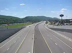 I-99/US 220 continues northeast between a mountain to the east in an agricultural valley to the west, coming to an interchange with the southern terminus of PA 865 near Bellwood. Near Tipton, the freeway has a trumpet interchange with US 220 Bus. that provides access to DelGrosso's Amusement Park. The highway continues to Tyrone, where it crosses the Little Juniata River before an interchange with PA 453. Past Tyrone, I-99/US 220 passes through forested areas and reaches a diamond interchange that serves PA 350 and the northern terminus of US 220 Bus. near Bald Eagle. From here, the freeway continues into Centre County and runs through rural areas before turning north to bypass Port Matilda to the west. I-99/US 220 has an interchange with the southern terminus of US 220 Alternate (US 220 Alt.) before the two routes merge into the US 322 freeway and head east concurrent with US 322. The freeway heads northeast away from Port Matilda and continues through more forests. I-99/US 220/US 322 curves southeast and reaches an interchange with Gray's Woods Boulevard near Gray's Woods. A short distance later, US 322 Bus. splits off at a northbound exit and southbound entrance to head into State College. Immediately after this interchange, a southbound exit and northbound entrance serves Valley Vista Drive and provides access to US 322 Bus. from southbound I-99/US 220/westbound US 322. The freeway continues east into more developed areas with some woods and comes to a diamond interchange at Waddle Road that serves Toftrees. The highway passes to the north of the Pennsylvania State University campus before I-99/US 220 split from the US 322 freeway at an interchange that also has access to the university by way of East Park Avenue.[1][2]