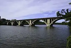 US 29 enters Washington DC via the Key Bridge adjacent to Georgetown University. The designation turns east onto the Whitehurst Freeway, bypassing Georgetown to the south. Upon crossing Rock Creek, the freeway ends, becoming the at-grade K Street. US 29 remains on K Street to 11th Street, where US 29 turns north onto 11th for seven blocks. At Rhode Island Avenue, US 29 turns right. US 29 northbound turns left at 6th Street (touching US 1 where it turns from Rhode Island Avenue to 6th Street); it follows 6th Street for two blocks and then turns left onto Florida Avenue, where it then turns right onto Georgia Avenue. US 29 southbound at this point, however, follows 7th Street to Rhode Island Avenue. The route maintains a northerly routing as it passes through northern Washington DC and enters Maryland. During its alignment with Georgia Avenue, US 29 bypasses the Howard University campus to the west.