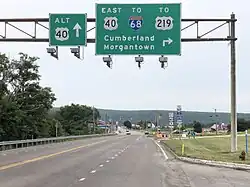 U.S. Route 40 Alternate (Alt US 40) is the U.S. Highway designation for a former segment of U.S. Route 40 (US 40) through Garrett and Allegany counties in Maryland. The highway begins at US 40 near exit 14 on Interstate 68 (I-68) and runs 31.80 miles (51.18 km) eastward to Cumberland, where it ends at exit 44 on I-68.[4] Alt US 40 is maintained by the Maryland State Highway Administration (MDSHA).