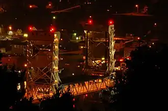 The lift bridge is the last of several previous crossings over the waterway. A wooden swing bridge was built in 1875.[70] A newer, iron swing bridge was built in 1897; this structure was partially destroyed in 1905 when it was struck by a ship.[70] This second crossing was rebuilt in 1906 and remained in service until the lift bridge was opened in December 1959.[70][71] The current bridge was last used for railroad traffic in the summer of 1982,[71] after the Soo Line rail lines north of Houghton were abandoned starting in 1976.[72] The middle section is left in an intermediate position for the warmer nine months of the year so that vehicle traffic can use the lower deck of the lift span and pleasure craft can pass under the bridge. In the winter, the lift span is lowered so snowmobiles and skiers can use the lower deck while cars and trucks use the upper deck.[71]