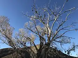 Nearby is a grove of cottonwoods, which includes a shoe tree. Patrons of the bar at Middlegate are unsure of the origin of the shoe tree; however, most believe it started sometime in the mid-1980s. A legend has formed about how a young man was traveling to Reno with his bride-to-be. When she balked and got out of the car, he threw her shoes in the tree so she couldn't get away. A reporter for the San Francisco Chronicle began to study the phenomenon of shoe trees after seeing the one at Middlegate, stating to his knowledge this was the biggest in the world.[20] It was discovered on December 31, 2010, that the original shoe tree had been chopped down, possibly by vandals. Since then visitors have started a new shoe tree with another tree in the grove.[21][22]