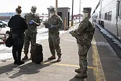 Montana National Guard screen out-of-state travelers at the Amtrak station in Shelby, Montana, on April 3, 2020.