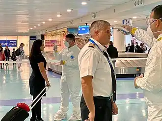 On January 31, three major U.S. airlines (Delta, American, and United) announced that beginning in early February they would suspend flights between the U.S. and China,[35][36] although United Airlines continued select flights for returning Americans.[37] Later that day, President Trump announced travel restrictions which would come into effect on February 2, preventing foreign nationals from entering the U.S. if they had been in China within the previous two weeks. The immediate family members of U.S. citizens and permanent residents were exempt from this restriction.[38][39] Major Chinese carriers began to suspend flights from China to the United States three days after the announcement of the travel restrictions.[37] In addition to restricting foreign nationals, Trump imposed a quarantine for up to 14 days on American citizens returning from Hubei, the main coronavirus hotspot at the time. This was the first quarantine order the U.S. federal government had issued in over 50 years.[38][39] Although at the time the WHO recommended against countries imposing travel restrictions,[40] Secretary Azar said the decision stemmed from the recommendations of HHS health officials.[41] The New York Times analyzed that more than 380,000 people arrived in the U.S. from China in January, including around 4,000 from Wuhan. After the restrictions began, almost 40,000 people arrived in the U.S. from China in February and March.[42]