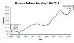 National defense spending is any government spending attributable to the maintenance and strengthening of the United States Armed Forces, including the Army, Navy, Marines, and the Air Force.[15] As of the fiscal year 2019 budget approved by Congress, national defense is the largest discretionary expenditure in the federal budget.[14] Figure C provides a historical picture of military spending over the last few decades. In 1970, the United States government spent just over $80 billion on national defense. Over the next two decades, national defense spending increased steadily to around $300 billion per year.[11] Military spending fell in the 1990s, but increased markedly in the 2000s as a result of the War in Afghanistan and Iraq. Military spending was cut slightly during the Obama administration, but the Trump administration planned to ramp up military spending to combat ISIL. National defense spending was expected to be $678 billion in 2019, an amount greater than the military expenditures of the next nine countries combined.[16]