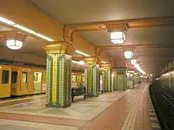 The Residenzstraße station, intended to be reminiscent of the Berlin Imperial palace, is decorated with plans of the now destroyed Stadtschloß. The supporting pillars are decorated in very bright colours and probably intended to evoke the rich carpets of the residence. Paracelsus-Bad station was designed to evoke associations with the nearby swimming baths. In addition there are pictures on the wall, one of which shows the doctor and philosopher Paracelsus (Theophrastus Bombastus von Hohenheim).