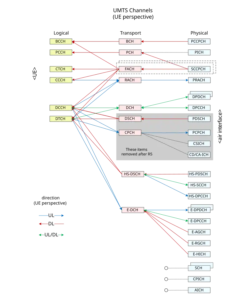 The UMTS channels are communication channels used by third generation (3G) wireless Universal Mobile Telecommunications System (UMTS) networks. [1][2][3] UMTS channels can be divided into three levels:
