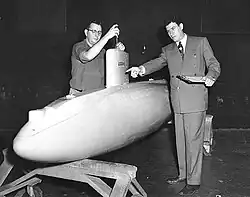 Late in World War II, committees on both sides of the Iron Curtain studied postwar uses of atomic energy and recommended the development of nuclear propulsion for ships. Since nuclear power plants would operate without the oxygen supply needed by conventional machinery, and since techniques were available for oxygen generation and carbon dioxide removal, submarine designers turned their attention to vessels that could operate for long periods without surfacing. Veteran submariners visualized a new type of submarine in which surface performance characteristics would be completely subordinated to high submerged speed and agility. In 1949 a special committee began a series of hydrodynamic studies, which led to a program within the U.S. Bureau of Ships to determine what hull form would be best for submerged operation. The David Taylor Model Basin in Maryland tested a series of designs. The best two—one with a single propeller and the other with dual screws—were then tested in a wind tunnel at Langley Air Force Base in Virginia.[10][11] To avoid interference from the various departments of the Navy, Admiral Momsen proposed to build a submarine as a practice target for aircraft carriers to practice Anti-submarine Warfare against, and directed the Bureau of Ships to design an unarmed submarine for speed.[12][13][14] The single-screw version was adopted, and construction of an experimental submarine to this design was authorized on 25 November 1950. The hull of the Albacore utilized HY-80 high-strength steel[3] with a yield strength of 80,000 psi (550 MPa), although this was not initially used to increase the diving depth relative to other American submarines. HY-80 remained the standard submarine steel through the Los Angeles class.[15] Other components were made from high-tensile steel (HTS).[3] This ship was classified as an auxiliary submarine (AGSS-569) and named Albacore. In this instance, AGSS stands for Auxiliary General Submersible Submarine, which for the U.S. Navy meant the first hull of its kind for the fleet.[16]