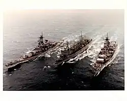 Sacramento (AOE-1) simultaneous UNREP with Wisconsin (BB-64) (foreground) and Missouri (BB-63) during Operation Desert Shield, January 1991.