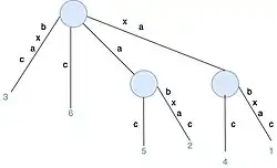 S[1..6]by adding suffixes ofxabxac(xabxac,abxac,bxac,xac,acandc). Rule 1 applies, which extends the path label in existing leaf edge. Rule 2 applies, which creates a new leaf node (in this case, three new leaf edges and two new internal nodes are created).