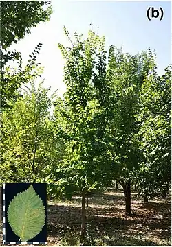 In the trials at Puerta de Hierro, Madrid, "Dehesa de la Villa" grew monopodially at a relatively slow rate of 63 cm per year. Corky tissue is present on branches. The leaves, on 6 mm petioles, are elliptic, typically acuminate at the apex, the average length and width 55 × 36 mm, the margins doubly serrate. Foliar density relative to 'Sapporo Autumn Gold' is described as 'high'. In the Madrid study, the appearance of the tree was rated 4.3 / 5.[1] The tree was the first of the Madrid clones to leaf in southern England, flushing in the first week of April. Where grown on fertile loam at the Grange Farm Arboretum in Lincolnshire, the tree attained sexual maturity aged six years, and also commenced suckering from roots.[2]