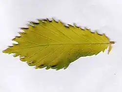 The tree is distinguished by its 'Viminalis'-type leaves (4–7 cm x 3 cm) suffused golden yellow in early summer, greening as the season progresses.[4][5][6] Clibran's of Altrincham (see 'Cultivation') described the coloration as "golden-bronze".[7] Rehder noted that 'Viminalis Aurea' has been distinguished from 'Viminalis' by the more deeply incised usually obovate leaves, but the two forms of leaves pass gradually into each other and may be found even on the same plant.[8][9]