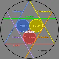 By finding sacred items and exploring dungeons the player demonstrates Honor. This Virtue is embodied by Dupre the Paladin. - Spirituality: Truth, Love, and Courage