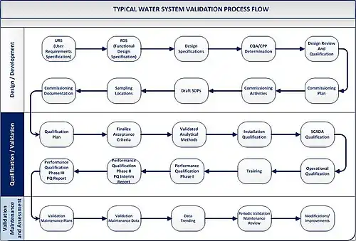 Ultrapure water validation must utilize a risk-based lifecycle approach.[15][16][17][18] This approach consists of three stages – design and development, qualification, and continued verification. One should utilize current regulatory guidance to comply with regulatory expectations. Typical guidance documents to consult at the time of writing are: FDA Guide to Inspections of High Purity Water Systems, High Purity Water Systems (7/93),[19] the EMEA CPMP/CVMP Note for Guidance on Quality of Water for Pharmaceutical Use (London, 2002),[20] and USP Monograph <1231> Water For Pharmaceutical Purposes.[21] However, other jurisdictions' documents may exist, and it is a responsibility of practitioners validating water systems to consult those. Currently, the World Health Organization (WHO) [22] as well as the Pharmaceutical Inspection Co-operation Scheme (PIC/S) [23] developed technical documents which outline validation requirements and strategies for water systems.